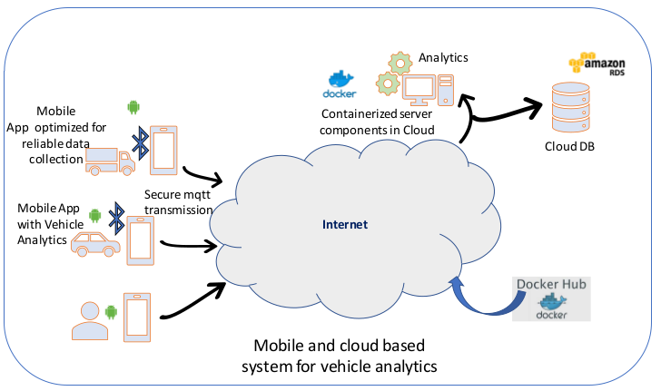 The above diagram represents a cloud and mobile based system developed for vehicle data capturing and analytics.
